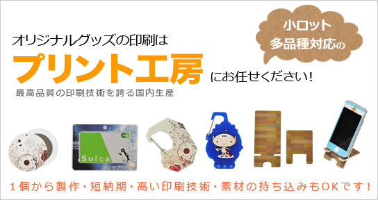 【 オリジナルグッズの印刷ならお任せください 】 スマホケース、パスケース、テープカッター、定規、鏡など、 素材が平面で固ければ何でも印刷できます! 文房具などのオリジナルグッズを、小ロット・多品種で検討されている方、 まとめてプリント工房にお任せください! 【 素材の持ち込みもOK! 】 ポリカーボネートやアクリルなど、硬くて平面なら何でも印刷できます! 1個からの持ち込みもOK! 直ぐにオリジナル印刷いたします! もちろん、工房で素材をご用意することもできますのでご安心ください。 ▼「国内生産のプリント工房」はこちらから http://www.jandc-supply.com/kobo.html