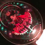 アクリルの表面と裏面に違うデザインを印刷した両面印刷です。表面は薄い水色で英文字を大きく配置し、円形を縁取るように太いラインを入れました。裏面はライブ会場のスポットライトが描かれています。暗闇の中で輝く光がライブ会場の活気と興奮に満ちた雰囲気を感じさせます。
