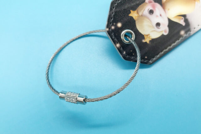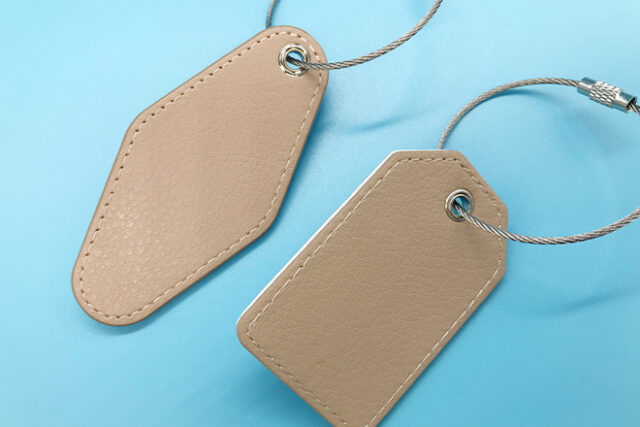 お客様のご注文で製作したPUレザーキーホルダーです。形状はタグ型(縦63×横40mm)と、モーテルキー型(取り扱い終了)の2種類を作成しました。