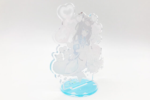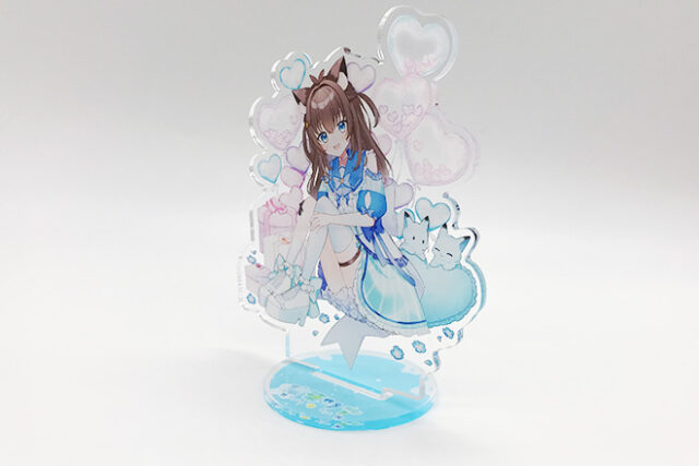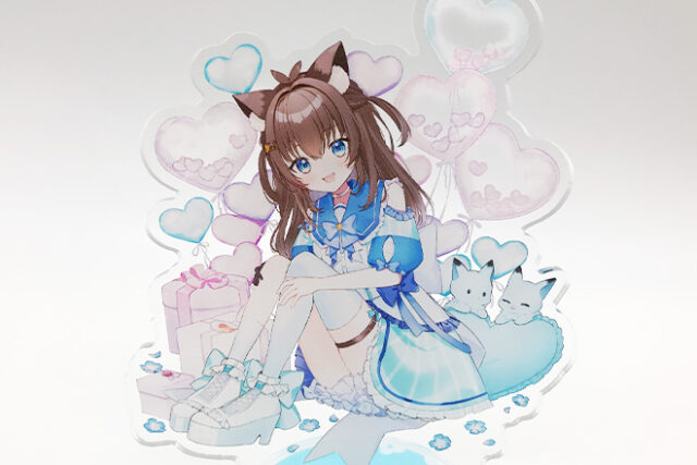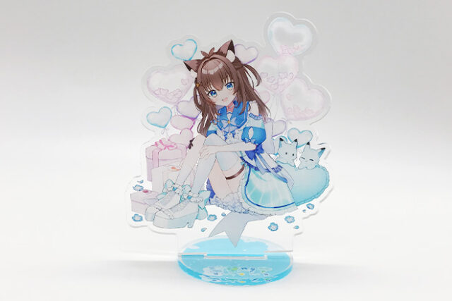 お客様のご注文で製作したアクリルスタンド(プレートタイプ)です。淡い水色をベースにした優しい色調の中、かわいらしいドレスを着たキャラクターがちょこんと座っています。周囲にはハートやプレゼントが散りばめられ、そばには二匹のネコが寄り添い、全体にいっそうキュートな雰囲気を添えています。また、ハート型の風船は一部を透けさせることで、立体感と軽やかさのある表現に仕上げました。