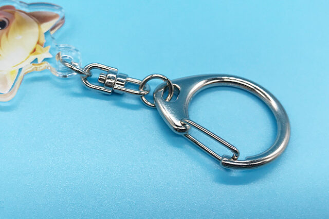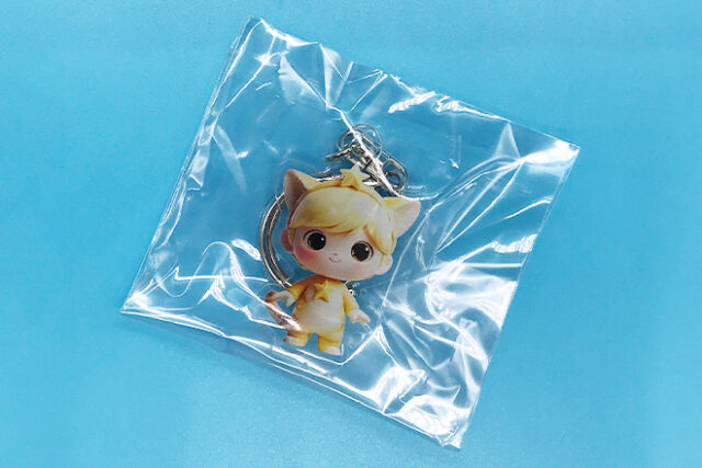 クリルを自由な形状に仕上げられるオリジナル型で製作しました。黄色をメインカラーにしたキャラクターを大きく配置し、全体は丸みを帯びた優しいシルエットにまとめています。くりっとした丸い瞳が印象的で、眺めるだけで心が和むデザインです。