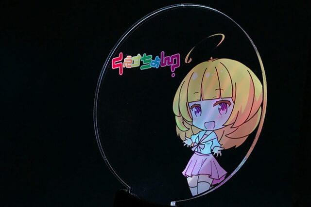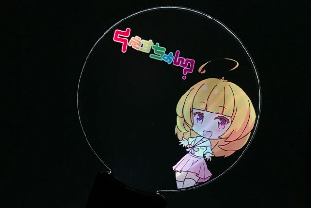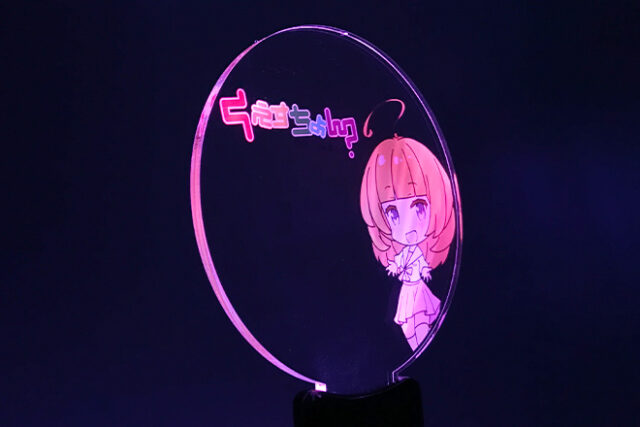デザインは、本体にブロンドヘアの愛らしい女の子をあしらい、ポップなカラーの文字と組み合わせることで、明るく楽しい印象に仕上げています。アクリルの透明感を存分に活かしているため、ライトのカラーが美しく映えます。