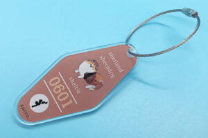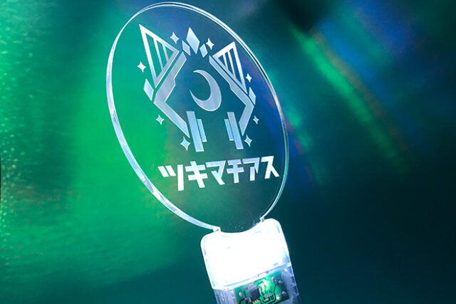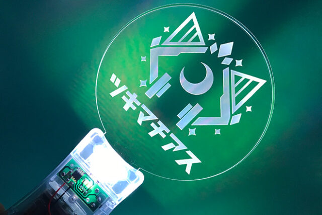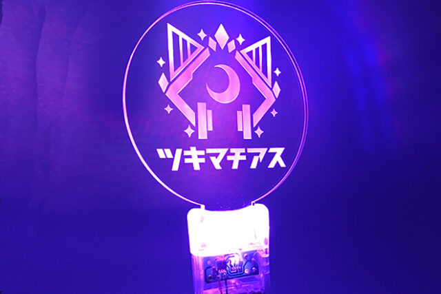 円形デザインの中央にオリジナルデザインを大きく配置し、シャープなフォルムに仕上げました。背景はアクリルの透明感を活かしており、ライトのカラーが美しく映えます。