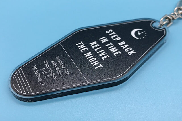 表面はネオン看板をイメージしたデザインを中央に配置し、その上に文字をバランスよくあしらいました。さらに、プレートの縁に沿って細いラインを入れることで、自然と視線が中央へ集まるように仕上げています。裏面には、文字と月のモチーフを白一色で表現しました。白と黒のコントラストが美しく、デザイン全体をくっきりと引き立てています。