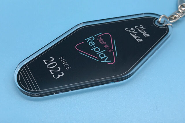 アクリルの表面にはフルカラー印刷を施し、裏面には白ベタ処理を加えることで、色の透けを防いでいます。印刷には発色に優れたインクジェット方式を採用しており、ネオンカラーの鮮やかさを美しく引き出しながら、細かな文字もくっきりと再現しています。